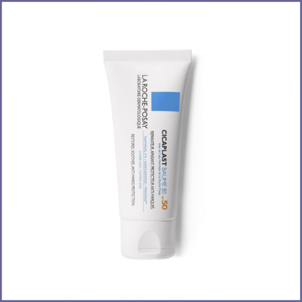 سيكابلاست بوم بي 5 بعامل حماية SPF 50 معزّز بالماديكاسوسيد، وهو مكون فعّال مرمّم، والبانثينول المهدئ، والنحاس، والزنك.